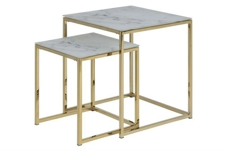 Zestaw stolików kawowych Alisma od duńskiej marki ACTONA.Dwa praktyczne stoliki ze szklanymi blatami z marmurowym nadrukiem.Blaty umieszczono na metalowych złotych podstawach.Dzięki możliwości schowania mniejszego stolika pod większym, oszczędzamy miejsce.Zestaw Alisma doskonale sprawdzi się we wnętrzach klasycznych.Wymiary: wys. 40 cm / szer. 35 cm / gł. 35 cmWaga netto: 20 kgWymiary opakowania: 52 cm / 11,5 cm / 52 cm.