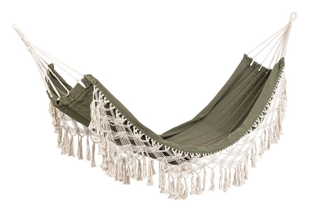 Zielony kolor hamaka dodaje stylowej świeżości i harmonijnie wpisuje się w każdą aranżację, od klasycznych po nowoczesne, delikatne, wiszące detale łączą prostotę z artystyczną swobodą boho, tworząc wyjątkowy klimat relaksu.