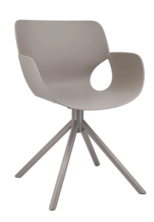 Charakterystyczne boczne wycięcie siedziska podkreśla jego nowoczesny kształt, a podłokietniki dodają komfortu.