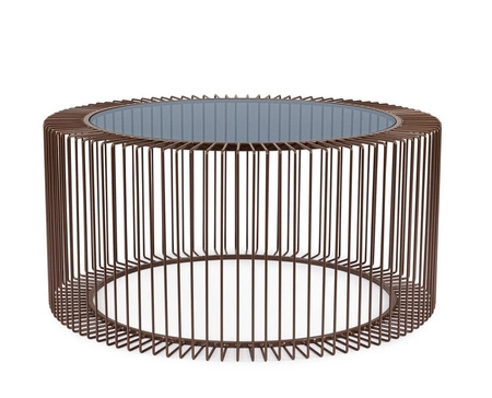 Posiada okrągły blat ze szkła hartowanego osadzonego na lekkiej, ażurowej podstawie.