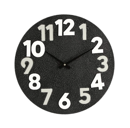 Czarna tarcza o wyrazistej, ziarnistej fakturze nadaje zegarowi głębię i wyrafinowany charakter, a nieregularnie rozmieszczone trójwymiarowe cyfry w odcieniach bieli i szarości tworzą dynamiczny, subtelnie artystyczny efekt wizualny.