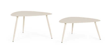 Zestaw dwóch stolików o unikalnej, przyciągającej uwagę formie i beżowym kolorze, który idealnie komponuje się w każdej przestrzeni.