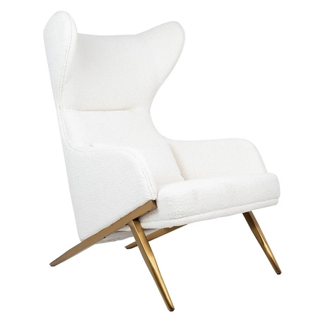 Fotel HAMPTON TEDDY to elegancki mebel, który łączy nowoczesny design z przytulnością. Jego minimalistyczna forma jest idealna do współczesnych wnętrz, a delikatna, biała tkanina teddy o pętelkowej teksturze nadaje mu wyjątkowy, przyjazny charakter. Złota, metalowa podstawa o unikalnym kształcie dodaje fotelowi wyrafinowanego stylu i podkreśla jego luksusowy wygląd, czyniąc go centralnym punktem w każdym pomieszczeniu.
