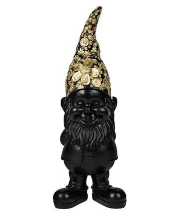 Nieco różniący się od tych już znanych, tradycyjnych krasnali ogrodowych: wyróżniający się złotą czapką w kwiatki i czarnym, eleganckim połyskującym wykończeniem. Bajkową, przyjazną figurę wykonano z żywicy.
