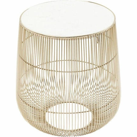 Złota podstawa wykonana z filigranowych prętów harmonijnie łączy się z okrągłym marmurowym blatem w białym kolorze, tworząc stylowy i praktyczny dodatek do każdego wnętrza. Połączenie naturalnego marmuru i mosiądzowanej stali nadaje stolikowi elegancki, wyrafinowany wygląd.