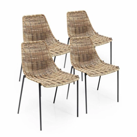 Wygodne siedzisko wykonano z tworzywa sztucznego, imitującego rattan a czarną, smukłą podstawę ze stali.