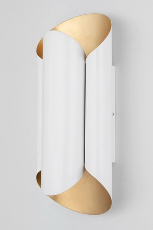 - Innowacyjny Design: Kinkiet charakteryzuje się unikalnym zakrzywionym kształtem, który elegancko łączy białą powierzchnię z złotymi wnętrzami, tworząc ciekawe efekty świetlne.