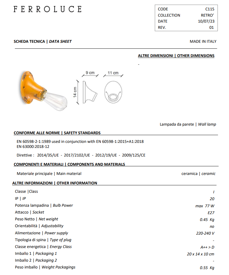 Kinkiet  C115 to elegancki dodatek, który wprowadzi do Twojego domu wyjątkowy klimat . Idealny do salonu, sypialni, czy przedpokoju, ten kinkiet zapewni ciepłe i przytulne oświetlenie. Wybierz jakość i styl od Ferroluce i ciesz się niepowtarzalnym designem każdego dnia.