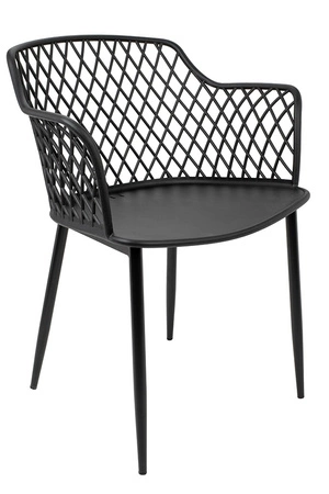 Krzesło BINN.Ciekawy, ażurowy design połączony z praktycznym zastosowaniem. Siedzisko zostało w całości wykonane z polipropylenu w czarnym matowym kolorze. Metalowa podstawa i szerokie siedzisko sprawiają, że krzesło jest stabilne i komfortowe.Wymiary: wys. 78,5 cm / szer. 62 cm / gł. 55,5 cmWysokość do krawędzi siedziska: 45,5 cmWysokość do podłokietników: 68,5 cmPodłokietniki: dł. 23 cm / szer. 2 cmSiedzisko: szer. 51,5 cm / gł. 44,5 cmOparcie: wys. 37 cm / szer. 38,5 cm Rozstaw nóg: przód szer. 48 cm / tył szer. 43,5 cm / gł. 45 cm / wys. 46 cmWymiary opakowania: 66 cm / 63 cm / 52 cm.