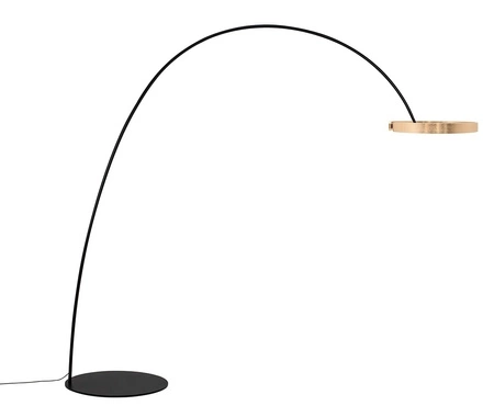 Nowoczesna propozycja łukowej lampy stojącej. Minimalistyczna, konstrukcja wykonana ze stali węglowej w kolorze czarnym, z designerskim kloszem w kształcie okręgu, doskonale sprawdzi się w wysokich pomieszczeniach. Oprawa włączana jest za pomocą dotykowego przycisku znajdującego się wewnątrz regulowanego klosza. Idealna do przestrzeni użyteczności publicznej.