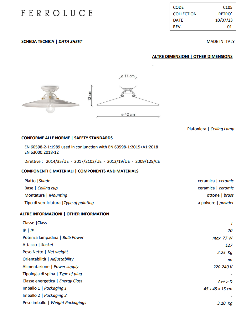 Lampa sufitowa Plafon Asti Ferroluce C105 dostępna jest w klasycznych kolorach: