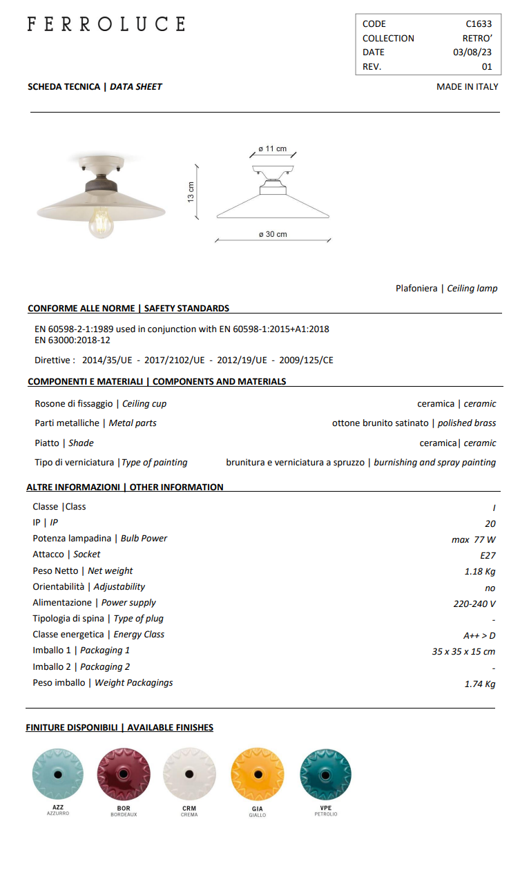 - Ceramika: Klosz wykonany z ceramiki, co jest typowe dla produktów Ferroluce i dodaje elegancji.