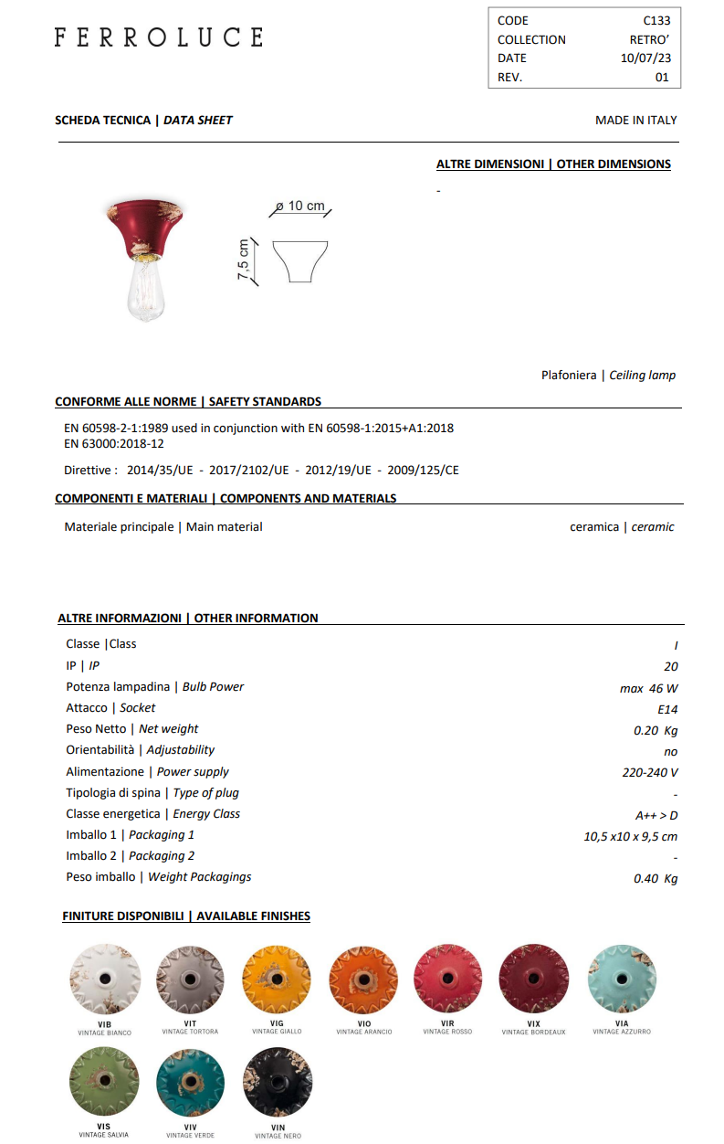 Lampa sufitowa plafon VINTAGE Ferroluce C133 to stylowy produkt włoskiej marki Ferroluce, znanej z produkcji ręcznie wykonanych lamp ceramicznych o unikalnym charakterze. Styl "Vintage" tej lampy jest wyrażony poprzez klasyczne kształty i bogatą paletę kolorystyczną, co pozwala na łatwe wkomponowanie jej w różnorodne wnętrza.