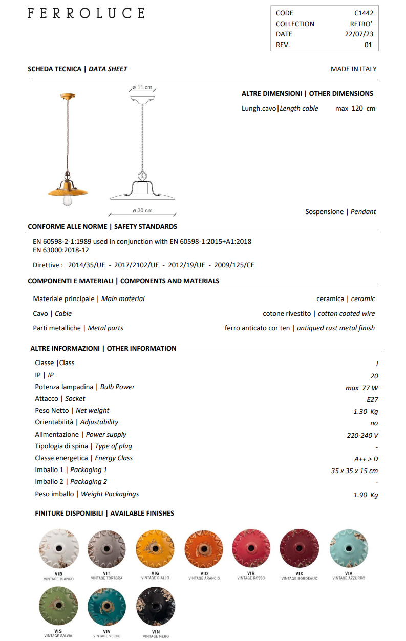 - Design: Styl "Country" często nawiązuje do prostoty i naturalności, co może być podkreślone przez użycie naturalnych kolorów, rustykalnych wykończeń i tradycyjnych wzorów. Lampa C1442 charakteryzuje się ciepłym, przytulnym wyglądem, który świetnie komponuje się z wnętrzami o wiejskim lub tradycyjnym charakterze.