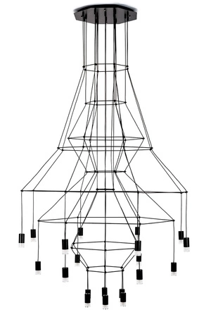 Lampa FLUSSO 20 w kolorze czarnym, została wykonana z przewodów osadzonych na stalowych prętach, które poprzez zagięcia nadają oprawie wyjątkowy kształt.