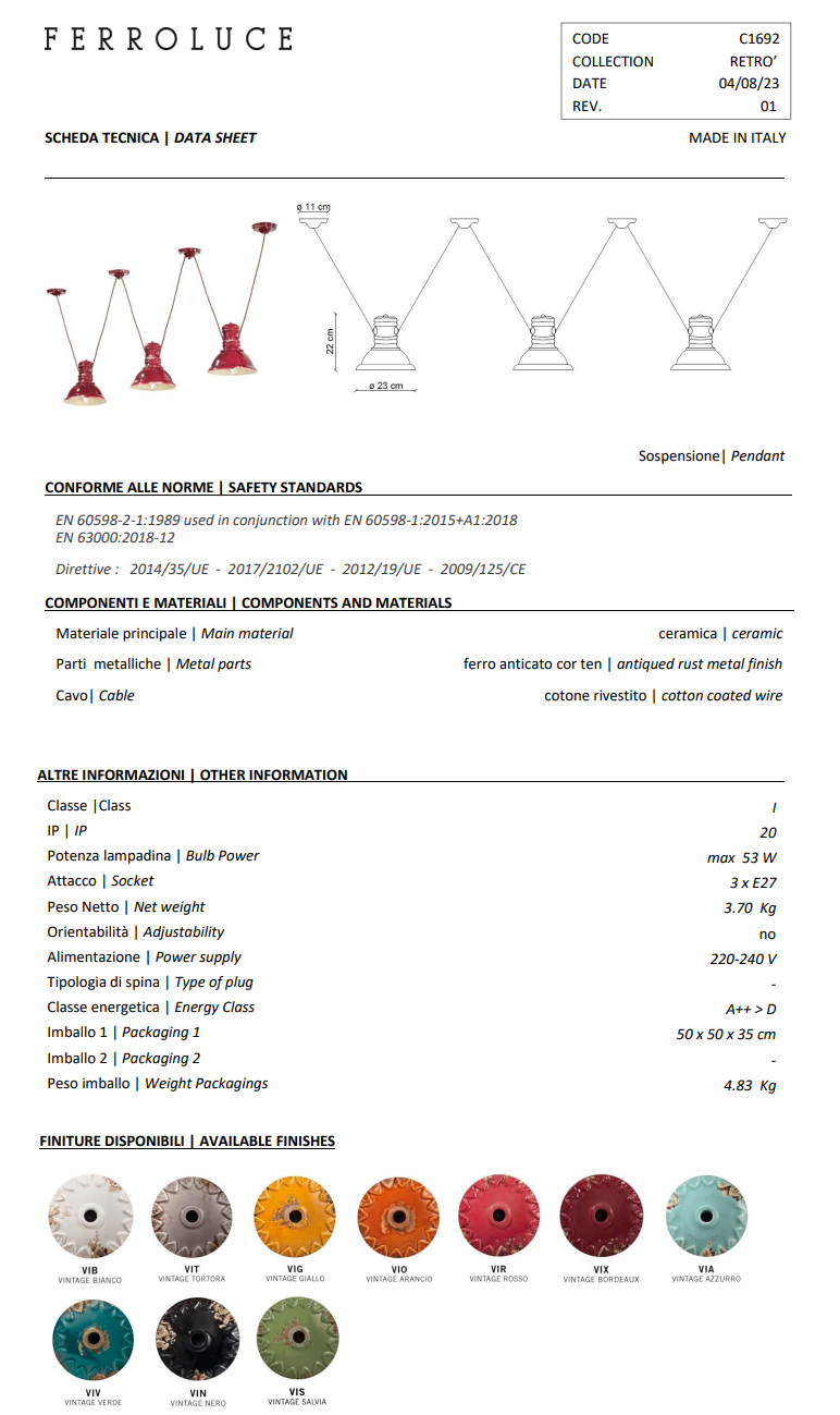 Lampa wisząca INDUSTRIAL Ferroluce C1692 to wyjątkowe połączenie stylu retro z przemysłowym charakterem. Wykonana z ceramiki i żelaza, posiada antyczne wykończenie, które nadaje jej unikalny wygląd. Dzięki różnorodności dostępnych wykończeń kolorystycznych, lampa ta idealnie wpasuje się w każde wnętrze w stylu industrialnym, vintage oraz loftowym, dodając mu niepowtarzalnego uroku.
