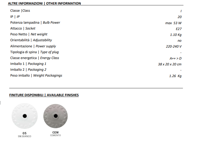 - Elementy metalowe: Wykończenie żelazne w kolorze srebra (FIN.05) lub czarnym matowym (FIN.CEM)