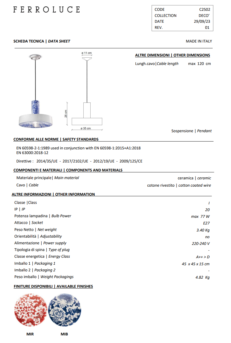 Lampa wisząca C2502 od Ferroluce, znanej z produkcji włoskiej wysokiej jakości oświetlenia.
