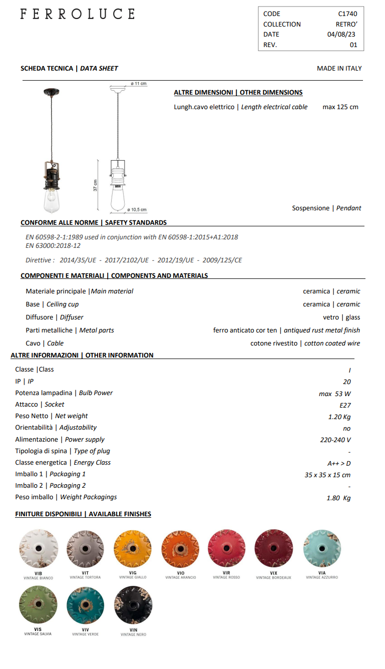 Lampa wisząca Urban Ferroluce C1740 jest wyjątkowym elementem oświetleniowym z kolekcji Retro', która łączy w sobie elementy vintage z nowoczesnymi rozwiązaniami technicznymi. Jest to elegancka lampa, która świetnie wpasuje się w różne stylizacje wnętrz, szczególnie te nawiązujące do przeszłości lub industrialne.