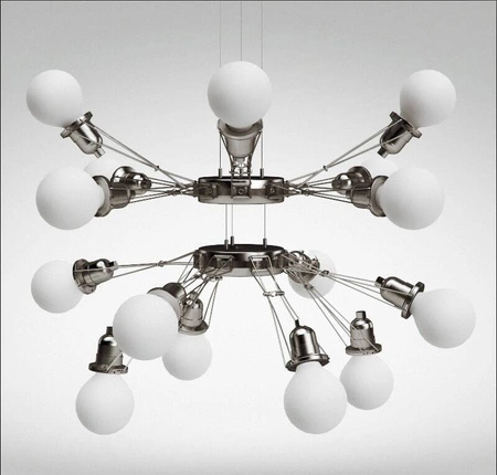 Postmodern in style, the Matrix Doppia Suspension Lamp offers total versatility by virtue of its 16 mobile arms. Users can individually position these arms to create their desired lighting setups. These arms are arranged in two sets of eight to create a sense of balance (doppia is Italian for double). The unit is fashioned from hardy stainless steel with a nickel-plated centre piece, canopy and sockets. With a suspension height of 200cm and a diameter of 13cm, the Matrix Doppia Suspension Lamp brings a flexible elegance to any room.