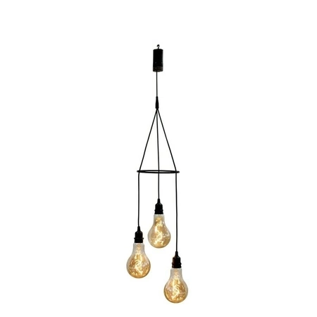 NEW GARDEN lampa wisząca CHIARA 65.Bezprzewodowa lampa wisząca Chiara składa się z trzech żarówek w stylu vintage na różnych wysokościach.Zawiera panel słoneczny do ładowania oraz pilota do włączania i wyłączania oraz regulacji trzech poziomów intensywności.W zestawie wymienne żarówki.IP: 54System mocowania: hak do zawieszania/magnesBateria: 3x2600mAh litowa (w zestawie)Żywotność baterii przy bezpośrednim ładowaniu: Do 15 godzinŻywotność baterii przy ładowaniu solarnym: do 15 godzinMoc panelu słonecznego: 2WBezpośredni czas ładowania: 4-6hPrawdziwa moc: 3 x 4,5WMoc oświetlenia: 200 Lm / ŻarówkaTyp żarówki: PS100 E27Metoda ładowania: wejście MicroUSB 5VDC (tylko kabel)USB- MicroUSB w zestawie)/Panel słonecznyTemperatura światła: 2500K – 2900KMożliwość przyciemniania: TakDługość kabla adaptera: 1mWaga: 0,7kgWymiar opakowania: 23,5 x21,5 x 19cm.