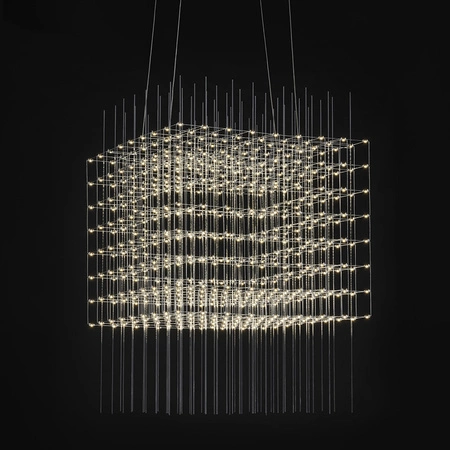 Cosmos Square 100 wygląda na uporządkowaną, ale wciąż harmonijną. Modułowo rozmieszczone płytki drukowane LED i maleńkie metalowe pręty to jedyne dwa podstawowe elementy tej oprawy. To one nadają lampie jej strukturę i kształt. Płytki drukowane mają diody LED po obu stronach. 2/3 światła idzie w dół, a 1/3 w górę.