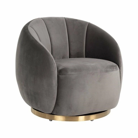 RICHMOND fotel obrotowy JAGO szary.Jago to fotel, przywołujący kobiecy urok, który nada każdej przestrzeni wygląd w stylu Glamour.Piękne siedzisko tapicerowano wysokiej jakości tkaniną welurową w eleganckim, szarym odcieniu i oparto na okrągłej, szczotkowanej złotej podstawie obrotowej.Jago jest dostępny w kolorze białym bouclé, beżowym oraz kamiennym szarym aksamitnym welurze.Wymiary: wys. 75 cm / szer. 80 cm / gł. 80 cmWaga netto: 24 kg.
