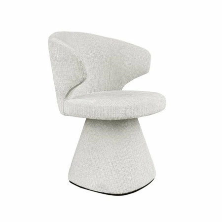 Kształtne oparcie, siedzisko oraz podstawę wykończono jasną tkaniną szenilową o właściwościach trudnopalnych.