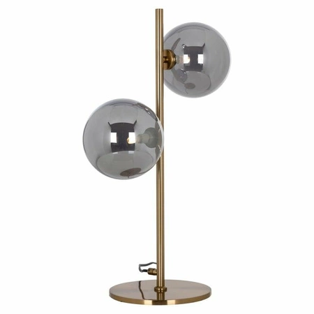Na metalowej podstawie w złotej kolorystyce umieszczono dwa okrągłe dymione klosze wykonane ze szkła.