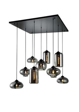 RICHMOND lampa wisząca AXELLE.Lampa wisząca Axelle marki Richmond Interiors jest nie tylko estetyczna, ale i jedyna w swoim rodzaju. Kwadratowa, metalowa czarna podsufitka pięknie równoważy dziewięć półprzezroczystych czarnych szkieł o różnych kształtach i rozmiarach. To artystyczne rozwiązanie oświetleniowe do nowoczesnych lub industrialnych domów.Światło: 9 x E27 max. 40 W (brak w zestawie)Oprawa: wys. 130 cm / szer. 104 cm / gł. 104 cmMontaż: instalacja sufitowaWaga netto: 25,4 kg.