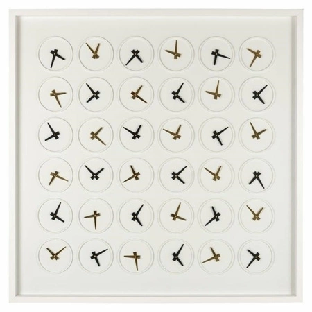 RICHMOND obraz TIME 90x90cm.Obraz ukazujący przemijanie oraz ważną rolę czasu.To dzieło sztuki przypomina nam o docenianiu krótkich, pięknych chwil.Całość wykonano na białej kwadratowej ramie w wyniku połączenia drewna, szkła oraz płyty MDF.Czarne i złote wskazówki ustawione są na różne godziny.To wspaniały, modernistyczny obraz.Wymiary: wys. 90 cm / szer. 90 cm / gł. 5 cmWaga brutto: 20 kg.