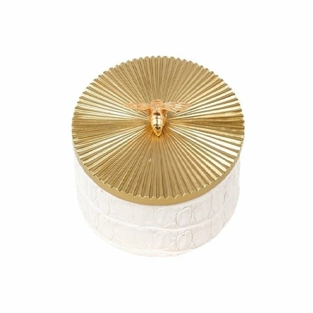 RICHMOND pojemnik na biżuterię BEEZ S biały.Okrągłe pudełko dekoracyjne z żywicy w stylu Glamour.Całość wykończono pięknymi, białymi rzeźbieniami imitującymi skórę krokodyla i pokrywką w złotym kolorze zwieńczoną delikatną złotą pszczołą.Beez to po prostu oszałamiający, luksusowy produkt do przechowywania biżuterii czy innych rzeczy codziennego użytku.To obowiązkowy element wyposażenia nowoczesnego, wolnego od bałaganu biurka czy toaletki.Dostępna także większa oraz czarna wersja.Wymiary: wys. 14 cm / szer. 16,5 cm / gł. 16,5 cmWaga brutto: 1,8 kg.