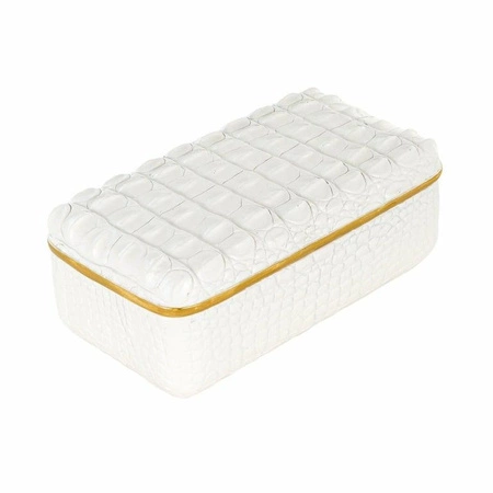 RICHMOND pojemnik na biżuterię COBE S biały.Pudełko do przechowywania biżuterii Cobe emanuje nowoczesną estetyką.Wykonane zostało z białej żywicy poliestrowej z rzeźbieniami przypominającymi skórę krokodyla. Prostokątny kształt, wykończony złotą ramką będzie doskonale pasował do współczesnych wnętrz w stylu Glamour.Dostępna także większa oraz czarna wersja.Wymiary: wys. 10 cm / szer. 24 cm / gł. 13,5 cmWaga netto: 1,7 kg.