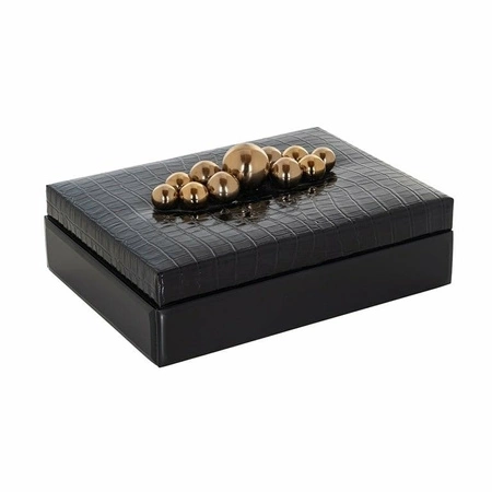 RICHMOND pojemnik na biżuterię NINA L czarny.Eleganckie pudełko do przechowywania biżuterii zostało ozdobione błyszczącym czarnym wykończeniem, wykonanym ze szkła, płyty MDF oraz metalu.Górna część pojemnika posiada ciekawe, wyraźne zdobienia oraz trzy złote kule, dodające całości charakteru oraz elegancji.Nina to nowoczesny sposób na zorganizowanie Twojej toaletki, półki, czy nawet stolika.Dostępna także mniejsza wersja.Wymiary: wys. 12 cm / szer. 28 cm / gł. 21 cmWaga netto: 1,4 kg.