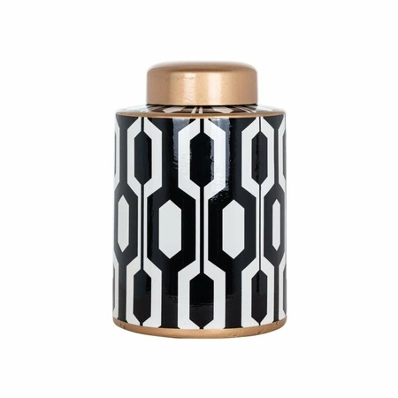 RICHMOND pojemnik ozdobny/wazon FAYLINN SMALL.Faylinn doskonale sprawdzi się jako funkcjonalny pojemnik lub pięny wazon na kwiaty a przy tym będzie niezwykle estetyczną dekoracją.Czarno-białe geometryczne wzory ze złotą pokrywką z ceramiki sprawiają, że element ten będzie wspaniałym dodatkiem do współczesnych wnętrz.Dostępna także większa wersja.Wymiary: wys. 27 cm / szer. 17,5 cm / gł. 17,5 cmWaga netto: 1,9 kg.