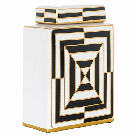 RICHMOND pojemnik ozdobny/wazon FILOU SMALL.Nowoczesna i stylowa dekoracja Filou doskonale wykorzystuje iluzję optyczną i geometrię, aby przyciągnąć nie jedno spojrzenie.Całość wykonano z białej ceramiki z czarnymi i złotymi wzorami.Filou to bardzo luksusowy element wpasowujący się w najnowsze trendy.Dostępna także większa wersja.Wymiary: wys. 27 cm / szer. 19 cm / gł. 10 cmWaga netto: 2 kg.