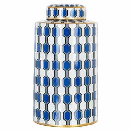 RICHMOND pojemnik ozdobny/wazon JANICE BIG.Ceramiczny pojemnik Janice został wzbogacony złotymi brzegami i niebieskimi wzorami.Stylowa i luksusowa dekoracja, będzie idealna do przechowywania akcesorii lub pięknych kwiatów.Dostępna także mniejsza oraz różowa wersja.Wymiary: wys. 33 cm / szer. 17 cm / gł. 17 cmWaga netto: 2,9 kg.