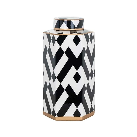 RICHMOND pojemnik ozdobny/wazon LATRELL.Designerska ceramiczna amfora w kolorze biało-czarnym wykończona miedzianą lamówką. Latrell świetnie sprawdzi się jako dekoracyjny wazon z pokrywką. Waga netto: 2 kgSposób wysyłki: Paczka.