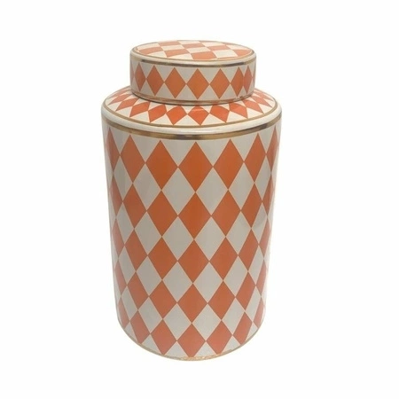 RICHMOND pojemnik ozdobny/wazon LORELIA.Elegancki element dekoracyjny wykonany w całości w wyniku połączenia kamienia i gliny.Lorelia prezentuje się cudownie dzięki stonowanej pomarańczowej kolorystyce i delikatnym złotym akcentom.Geometryczne wzory dodają mu poczucia estetyki oraz wrażenia trójwymiarowości.Dostępna także mniejsza wersja pod nazwą Lonne.Wymiary: wys. 27 cm / szer. 15,5 cm / gł. 15,5 cm.