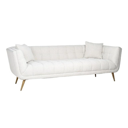 RICHMOND sofa HUXLEY BOUCLE.Huxley to solidnie wykonana sofa z drewnianej ramy i modnej białej tapicerki bouclé (100% poliester).Szczotkowane złote nóżki ze stali nierdzewnej dodają jej charakteru i elegancji.Bouclé to najmodniejsza tkanina sezonu.Sofa Huxley to niezbędny element przytulnego i stylowego domu.Dostępna również wersja w tkaninie welurowej w różnych odcieniach.Polecamy zestawić z pufą oraz fotelem Huxley.Wymiary: wys. 75 cm / szer. 230 cm / gł. 91 cmWaga brutto: 51,6 kg.
