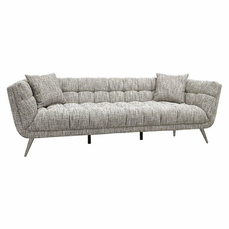 Konstrukcja sofy oparta jest na solidnym drewnie i stalowych nogach ze stali nierdzewnej, co gwarantuje stabilność i wytrzymałość.