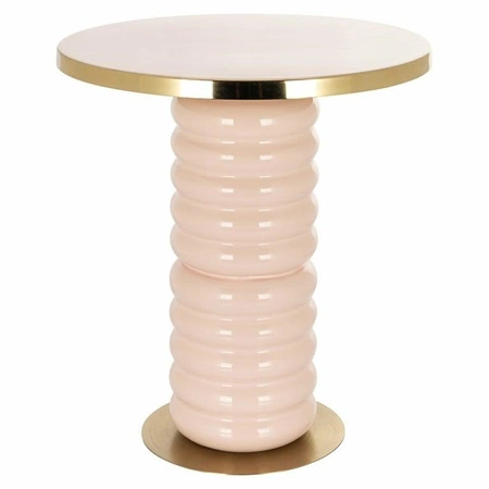 Wykonany z jasnoróżowego metalu o cylindrycznej podstawie przyciąga wzrok swoim zaokrąglonym, falistym kształtem.