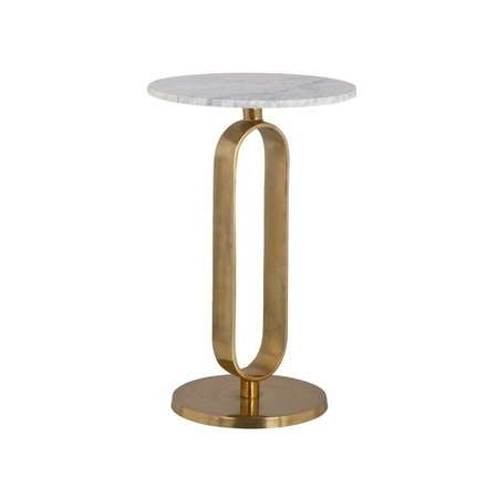 RICHMOND stolik CELINE 40.Szykowny i modny, stolik Celine prezentuje nowoczesny design.Okrągły blat zdobi elegancki marmurowy blat.Marmur jest trwałym rodzajem kamienia i ma luksusowy oraz stylowy wygląd.Kamień jest produktem naturalnym i charakteryzuje się unikalnym wykończeniem.Podstawę tworzy wytrzymały metal w złotym kolorze o ciekawym wzorze.Dostępna także czarna wersja kolorystyczna pod nazwą Valerio.Wymiary: wys. 61 cm / szer. 40 cm / gł. 40 cmWaga netto: 8,7 kg.