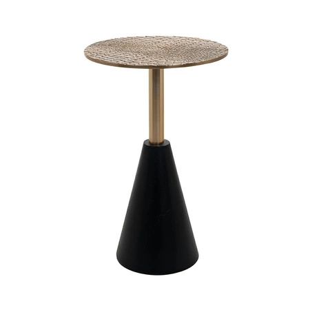 RICHMOND stolik kawowy COBRA 29 czarno-złoty.Złoty blat wykończony egzotycznym wzorem oraz oryginalny kształt stolika nada wnętrzu wyjątkowy styl.Cobra 29 został wykonany w całości z aluminium. Doskonale sprawdzi się w salonie jako stolik kawowy, a także pomocniczy.Wymiary: wys. 50 cm / szer. 33 cm / gł. 33 cmWaga netto: 5 kgWymiary opakowania: 48 cm / 30 cm / 30 cm.