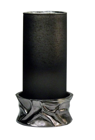 Cylindryczna forma i matowe wykończenie kontrastują z błyszczącą, artystycznie wyprofilowaną bazą, tworząc wyjątkowy element wystroju wnętrza.