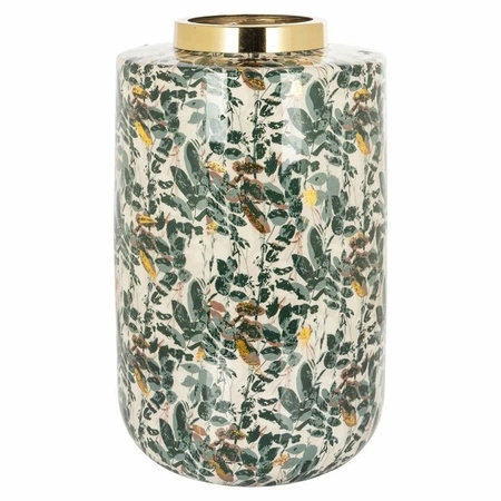 Powierzchnia wazonu zdobiona jest delikatnym, roślinnym wzorem w odcieniach zieleni, który dodaje elegancji i subtelności.