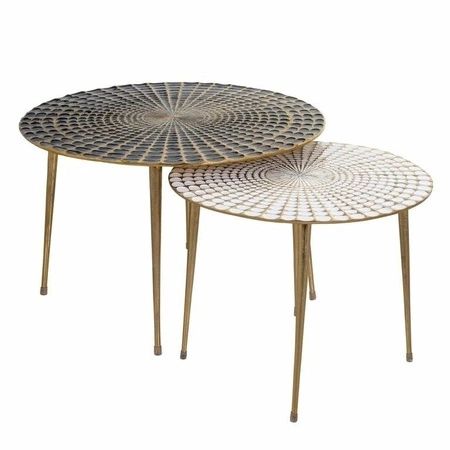 RICHMOND zestaw stolików ESMAY.Esmay marki Richmond Interiors to szykowny zestaw dwóch stolików kawowych o wyjątkowym designie.Całość wykonano z aluminium w odcieniach bieli i czerni połączonych z mosiężnymi detalami.Blaty stolików posiadają ciekawe geometryczne zdobienia imitujące perły.Esmay to luksusowa kolekcja, która ozdobi Twój dom niczym biżuteria, dodając elegancji oraz klasy.Ze stolików można korzystać razem lub osobno.Wymiary: wys. 45 cm / szer. 70 cm / gł. 70 cmWaga netto: 13,5 kg.