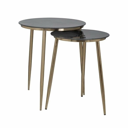 RICHMOND zestaw stolików FINLEY.Eleganckie i polerowane stoliki Finley od marki Richmond Interiors oferują nieskończoną ilość aranżacji, ponieważ mogą być używane razem lub pojedynczo do zaakcentowania wnętrza.Ten wielofunkcyjny mebel wyróżnia się smukłymi nogami w złotym kolorze oraz współczesnym, prostym stylem.Całość wykonano z metalu oraz aluminium, co nadaje industrialnego wyglądu.Wymiary: wys. 58,5 cm / szer. 50,5 cm / gł. 50,5 cmWaga netto: 9,9 kg.