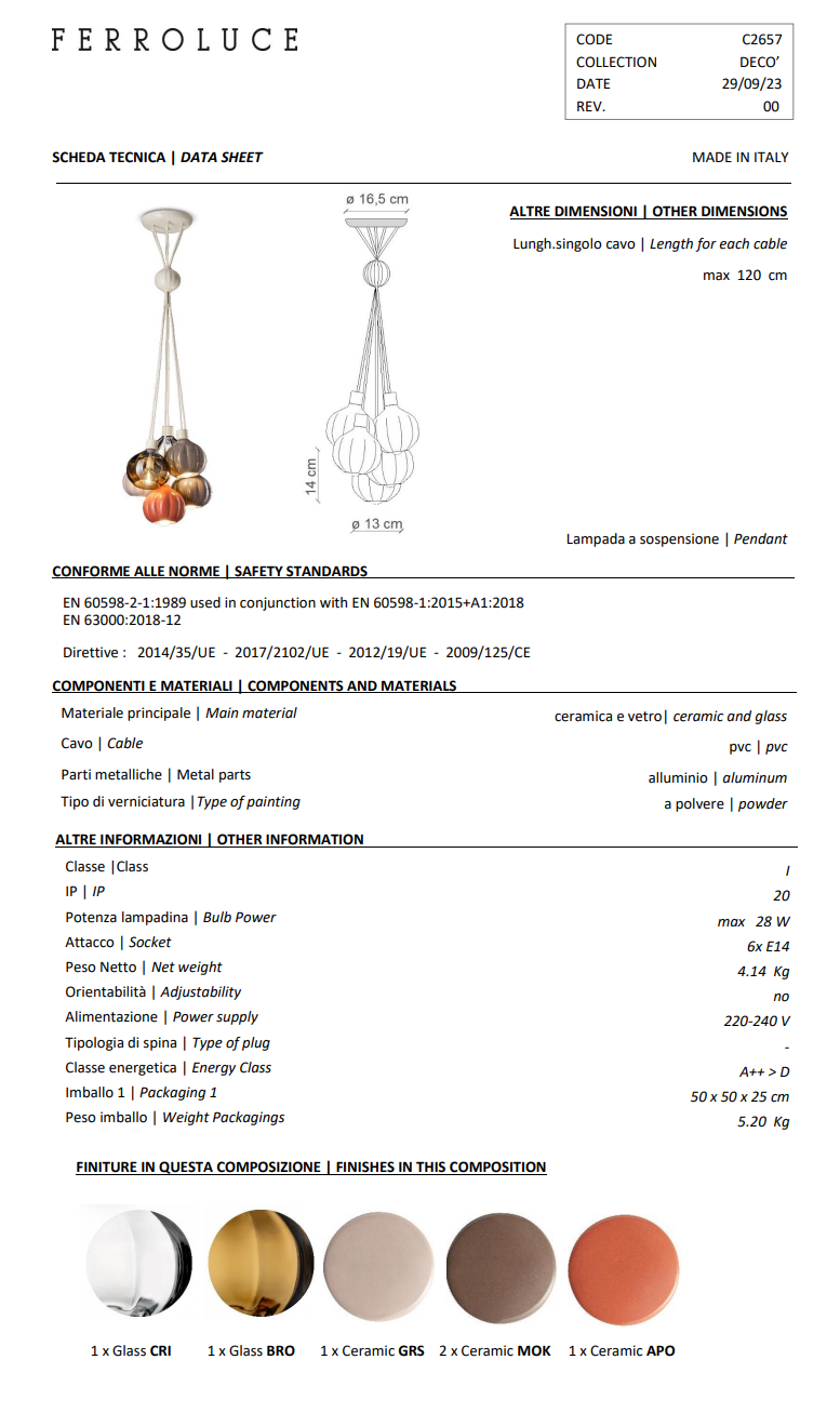 Lampa wisząca Ferroluce C2657 to stylowy i nowoczesny dodatek do wnętrza, charakteryzujący się unikatowym połączeniem ceramiki i szkła, co jest typowe dla produktów tej włoskiej marki.