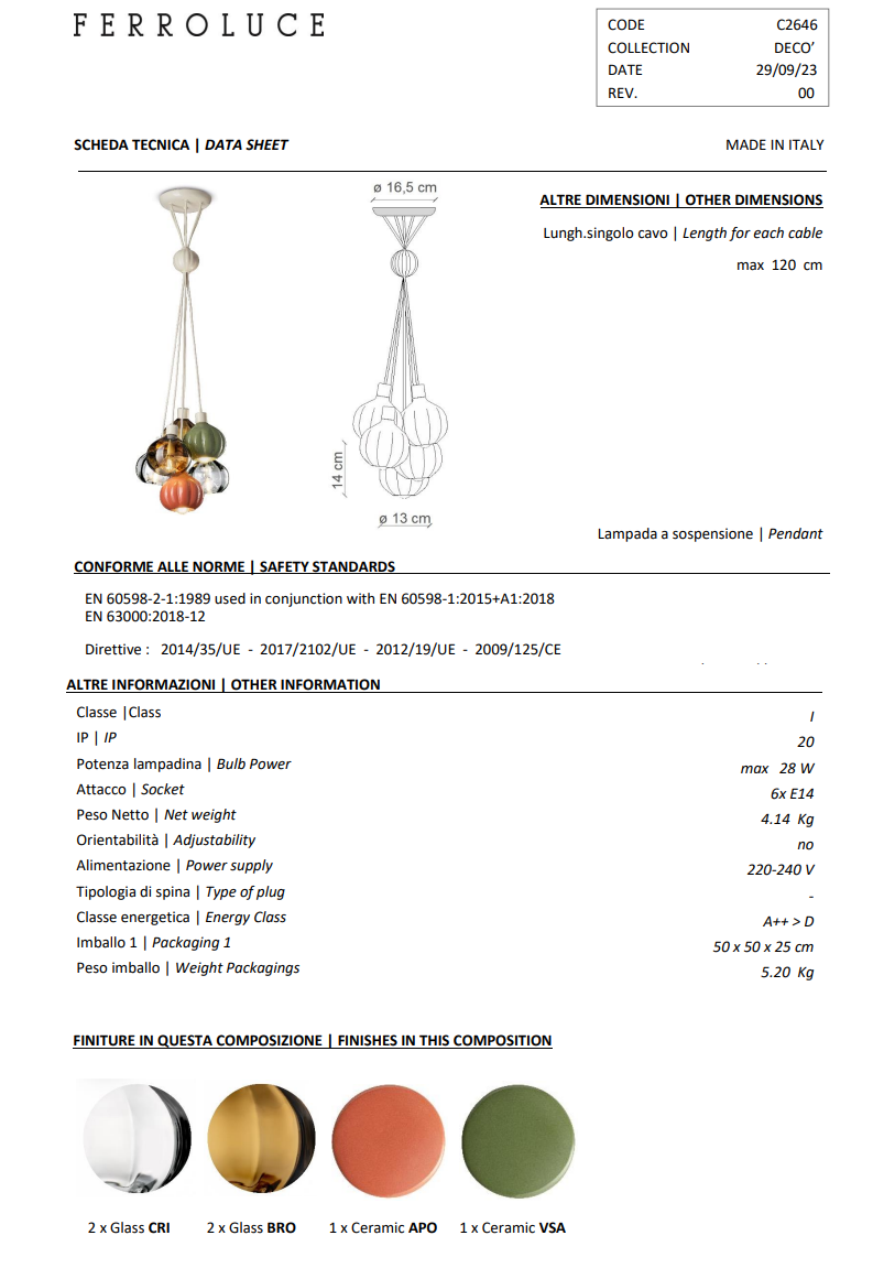 SOSPENSIONE 6 LUCI GRAPPOLO - mix acceso / 6-LIGHTS PENDANT - mix AFOXE' Ferroluce C2646-MIX